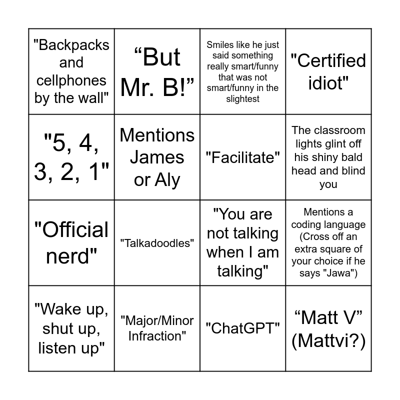 This bingo card has 20 words: Mentions a coding language (Cross off an extra square of your choice if he says "Jawa"), "See what I did there?", Smiles like he just said something really smart/funny that was not smart/funny in the slightest, Talks about Royal Martian, "Wake up, shut up, listen up", "5, 4, 3, 2, 1", "Major/Minor Infraction", "Backpacks and cellphones by the wall", "Official nerd", “But Mr. B!”, "Talkadoodles", "You are not talking when I am talking", Mentions James or Aly, “Matt V” (Mattvi?), "Facilitate", "Does anyone know _______? They're a senior.", The classroom lights glint off his shiny bald head and blind you, "Certified idiot", "ChatGPT" and "Close your lappytoppys".
