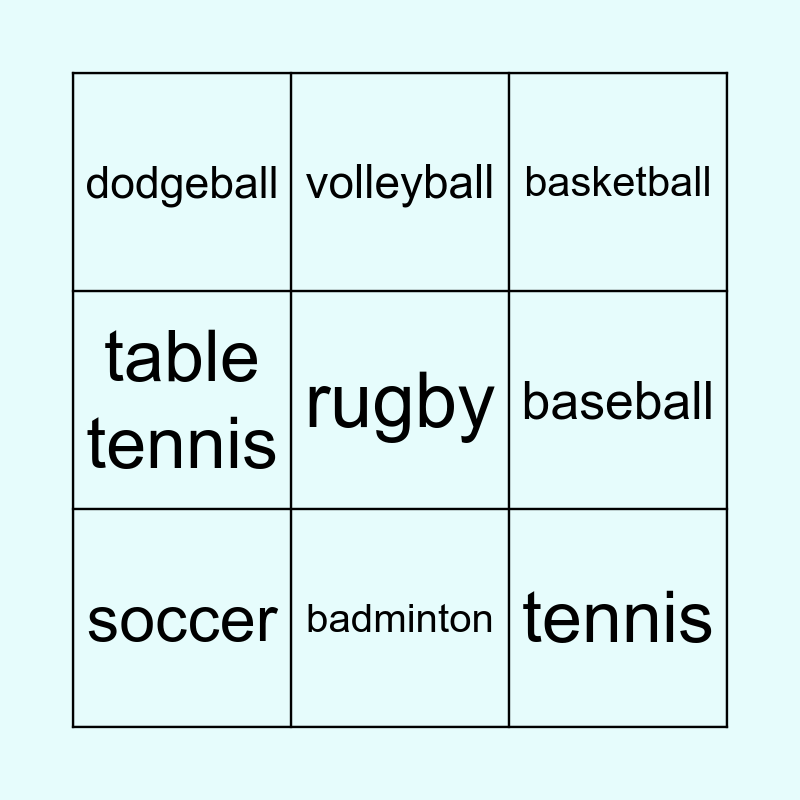 This bingo card has a free space and 8 words: baseball, basketball, volleyball, soccer, dodgeball, tennis, table tennis and badminton.