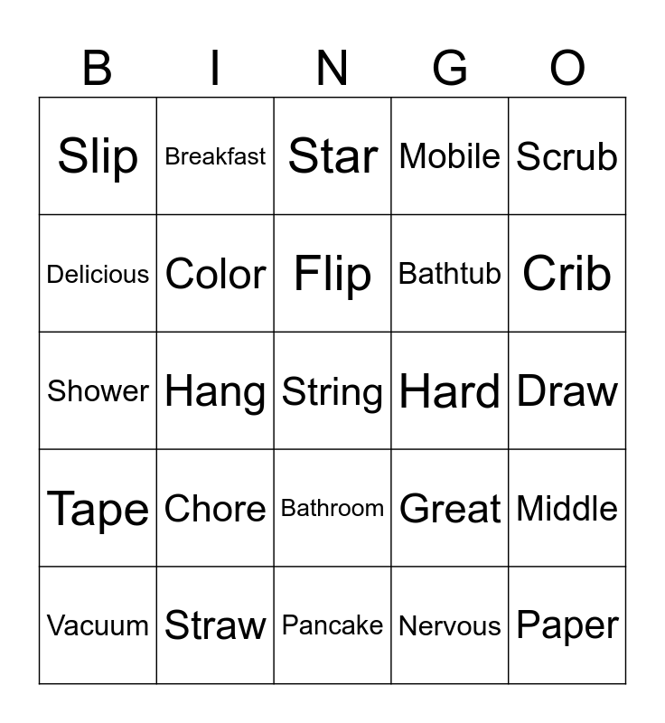 This bingo card has 25 words: Chore, Pancake, Flip, Vacuum, Scrub, Slip, Delicious, Breakfast, Hard, Bathroom, Bathtub, Shower, Great, Middle, Color, Paper, Draw, Star, Crib, Hang, String, Straw, Tape, Mobile and Nervous.