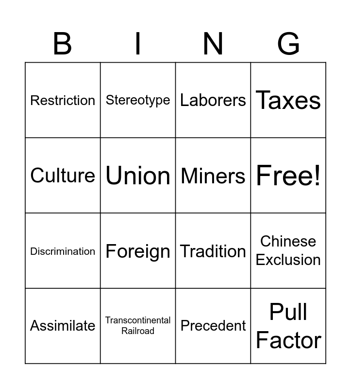 This bingo card has 17 words: Precedent, Assimilate, Laborers, Restriction, Foreign, Taxes, Chinese Exclusion, Miners, Free!, Union, Transcontinental Railroad, Tradition, Culture, Stereotype, Discrimination, Push Factor and Pull Factor.