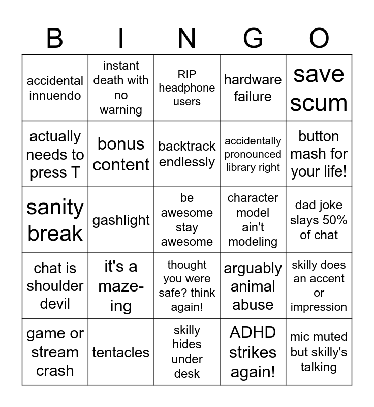 This bingo card has a free space and 34 words: jumps at harmless sounds, ADHD strikes again!, poll the chat, chat is shoulder angel, chat is shoulder devil, bonus content, save scum, game or stream crash, instant death with no warning, death by seemingly harmless action, backtrack endlessly, RIP headphone users, superchat greater than $50, voice actor acted too little/much, character model ain't modeling, button mash for your life!, tentacles, sanity break, it's a maze-ing, arguably animal abuse, thought you were safe? think again!, blame the devs, accidental innuendo, dad joke slays 50% of chat, skilly hides under desk, mic muted but skilly's talking, hardware failure, heart rate >=130, accidentally pronounced library right, actually needs to press T, spooked by something IRL, gashlight, skilly does an accent or impression and someone gets banned from chat.
