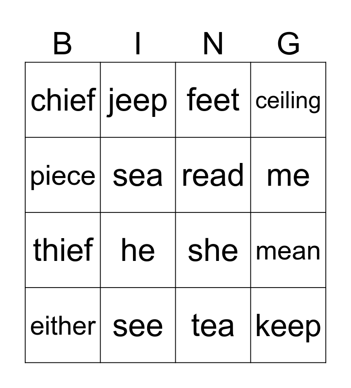 This bingo card has 16 words: see, mean, feet, chief, thief, jeep, she, tea, piece, sea, either, ceiling, he, me, read and keep.