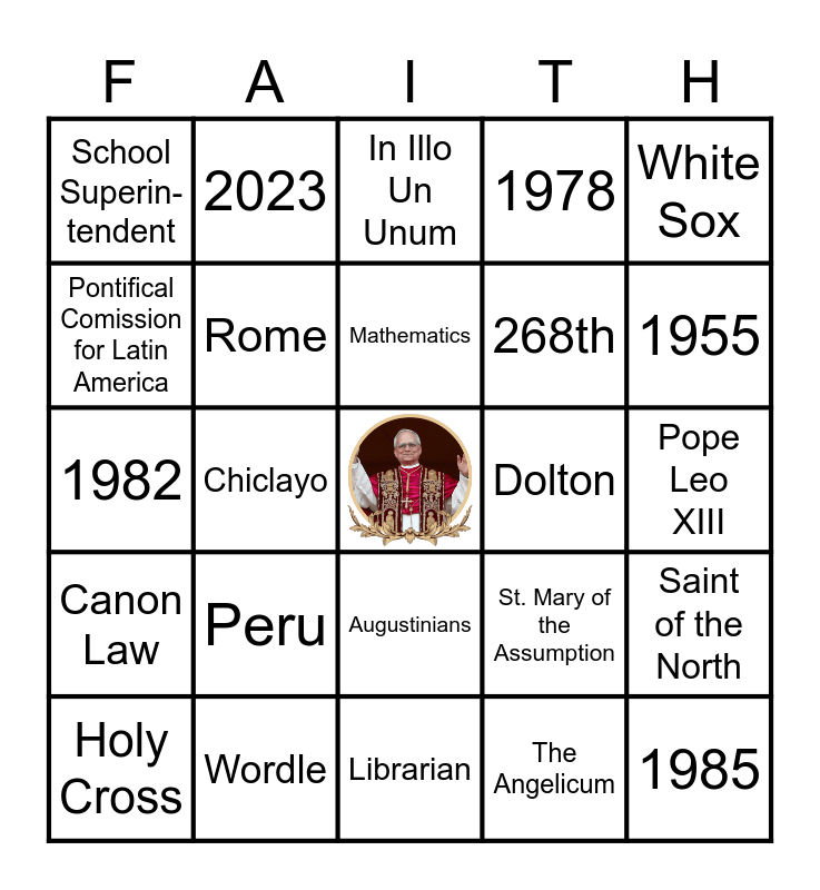 This bingo card has a free space and 24 words: Peru, Wordle, Mathematics, Holy Cross, White Sox, School Superin- tendent, Pontifical Comission for Latin America, 2023, Dolton, Augustinians, 268th, 1982, St. Mary of the Assumption, Saint of the North, Rome, The Angelicum, Pope Leo XIII, In Illo Un Unum, 1955, Chiclayo, 1985, Canon Law, 1978 and Librarian.