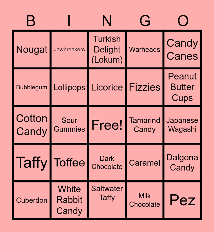 This bingo card has a free space and 36 words: Chocolate Bars, Gummies, Hard Candies, Lollipops, Caramel, Taffy, Licorice, Marshmallows, Candy Canes, Jellybeans, Sour Gummies, Warheads, Fruit Slices, Tamarind Candy, Peanut Butter Cups, Nougat, Pralines, Toffee, Pez, Turkish Delight (Lokum), Japanese Wagashi, Dalgona Candy, White Rabbit Candy, Cuberdon, Saltwater Taffy, Jawbreakers, Cotton Candy, Candy Buttons, Fizzies, Bubblegum, Chocolate Truffles, Chocolate-Covered Nuts, Milk Chocolate, Dark Chocolate, White Chocolate and Jelly Babies.