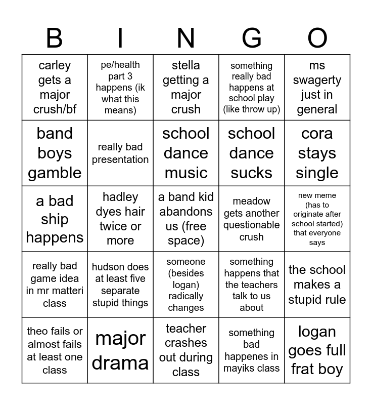 This bingo card has a free space and 24 words: hudson does at least five separate stupid things, major drama, school dance music, theo fails or almost fails at least one class, ms swagerty just in general, carley gets a major crush/bf, band boys gamble, pe/health part 3 happens (ik what this means), meadow gets another questionable crush, someone (besides logan) radically changes, school dance sucks, a bad ship happens, something happens that the teachers talk to us about, the school makes a stupid rule, really bad presentation, something bad happenes in mayiks class, new meme (has to originate after school started) that everyone says, stella getting a major crush, cora stays single, hadley dyes hair twice or more, logan goes full frat boy, really bad game idea in mr matteri class, something really bad happens at school play (like throw up) and teacher crashes out during class.