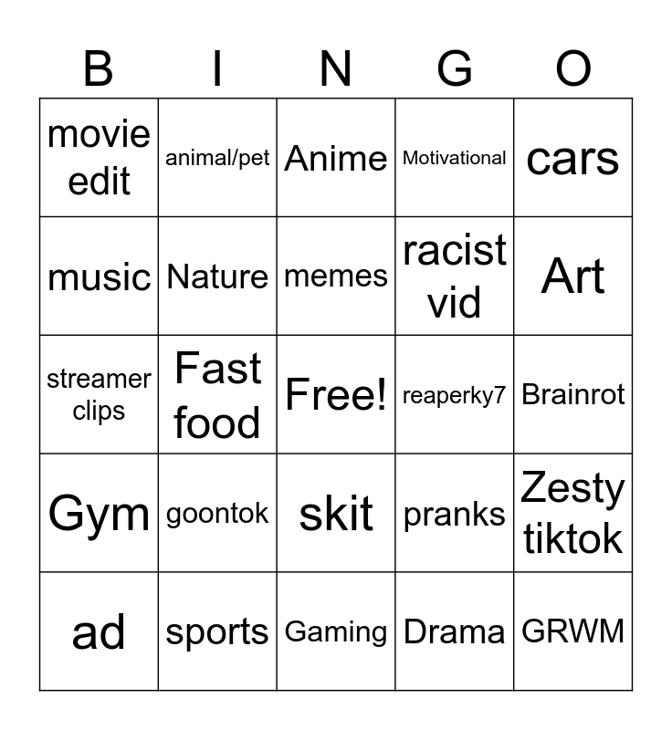This bingo card has a free space and 24 words: goontok, sports, memes, ad, cars, movie edit, music, animal/pet, reaperky7, skit, racist vid, streamer clips, pranks, Zesty tiktok, Nature, Drama, Brainrot, Anime, Art, Fast food, GRWM, Gym, Motivational and Gaming.