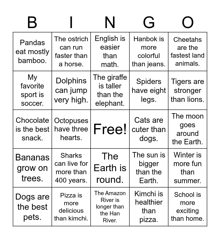 This bingo card has a free space and 24 words: Sharks can live for more than 400 years., Pizza is more delicious than kimchi., The giraffe is taller than the elephant., Dogs are the best pets., Cheetahs are the fastest land animals., Pandas eat mostly bamboo., My favorite sport is soccer., The ostrich can run faster than a horse., Cats are cuter than dogs., The Earth is round., Spiders have eight legs., Chocolate is the best snack., The sun is bigger than the Earth., Winter is more fun than summer., Dolphins can jump very high., Kimchi is healthier than pizza., The moon goes around the Earth., English is easier than math., Tigers are stronger than lions., Octopuses have three hearts., School is more exciting than home., Bananas grow on trees., Hanbok is more colorful than jeans. and The Amazon River is longer than the Han River..