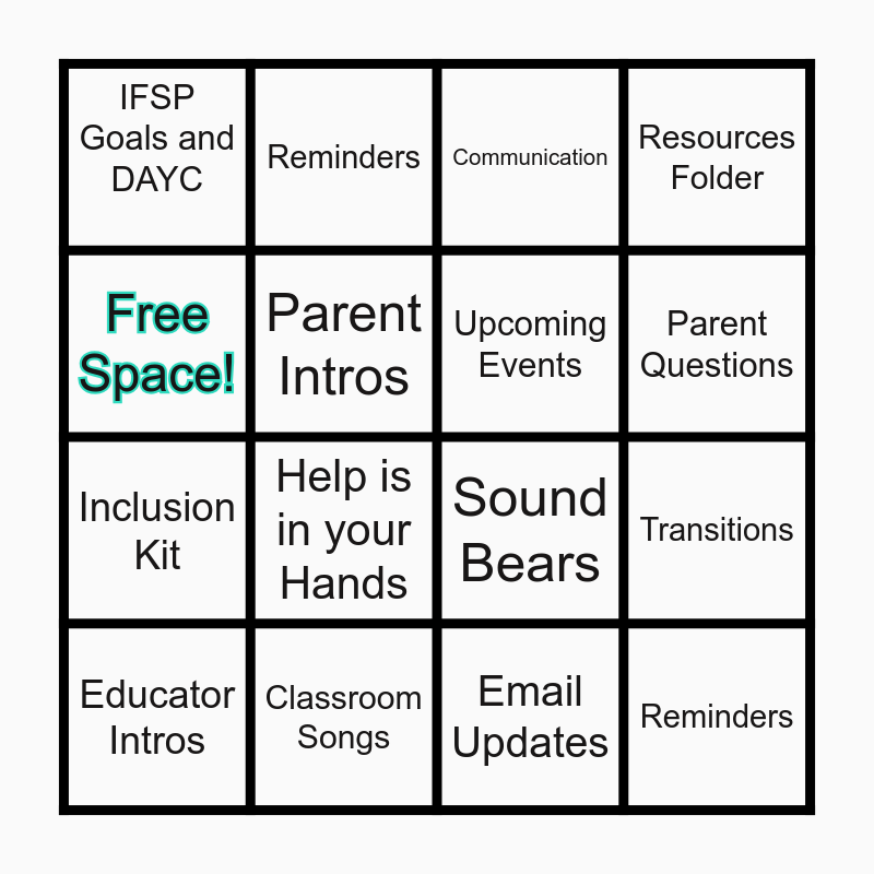 This bingo card has 16 words: Classroom Songs, Transitions, Communication, IFSP Goals and DAYC, Inclusion Kit, Reminders, Sound Bears, Email Updates, Free Space!, Parent Intros, Educator Intros, Resources Folder, Help is in your Hands, Parent Questions, Upcoming Events and Reminders.