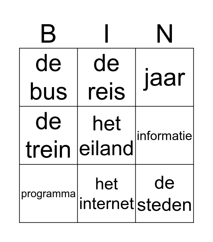 This bingo card has a free space and 8 words: informatie, jaar, de reis, programma, de bus, de steden, de trein and het internet.