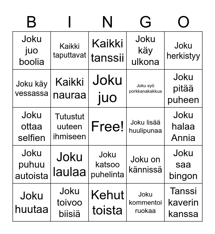 This bingo card has a free space and 24 words: Joku huutaa, Joku laulaa, Joku juo, Joku kommentoi ruokaa, Joku herkistyy, Joku juo boolia, Kaikki taputtavat, Kaikki tanssii, Joku lisää huulipunaa, Joku halaa Annia, Joku ottaa selfien, Kaikki nauraa, Joku on kännissä, Joku saa bingon, Joku käy vessassa, Joku toivoo biisiä, Kehut toista, Joku käy ulkona, Joku pitää puheen, Joku puhuu autoista, Tutustut uuteen ihmiseen, Joku katsoo puhelinta, Joku syö porkkanakakkua and Tanssi kaverin kanssa.