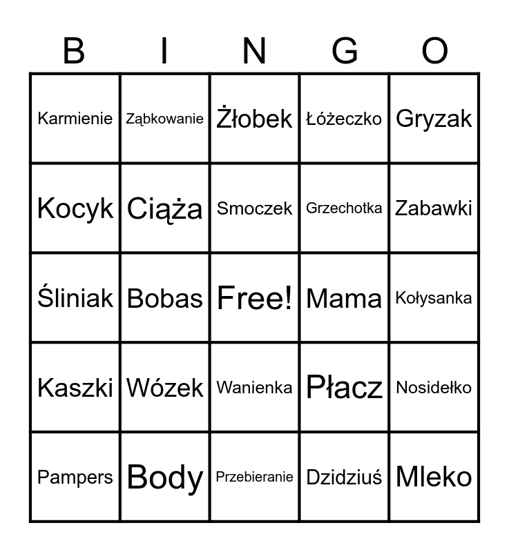 This bingo card has a free space and 24 words: Wózek, Body, Smoczek, Pampers, Gryzak, Karmienie, Kocyk, Ząbkowanie, Mama, Wanienka, Grzechotka, Śliniak, Płacz, Nosidełko, Ciąża, Dzidziuś, Kołysanka, Żłobek, Zabawki, Bobas, Mleko, Kaszki, Łóżeczko and Przebieranie.