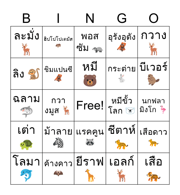 This bingo card has a free space and 50 words: ช้าง 🐘, เสือ 🐅, สิงโต 🦁, ยีราฟ 🦒, ม้าลาย 🦓, แรด 🦏, ฮิปโปโปเตมัส 🦛, จระเข้ 🐊, ลิง 🐒, ลิงกอริลลา 🦍, ชิมแปนซี 🦧, อุรังอุตัง 🦧, เสือดาว 🐆, ชีตาห์ 🐆, หมาป่า 🐺, สุนัขจิ้งจอก 🦊, หมี 🐻, หมีขั้วโลก 🐻❄️, แพนด้า 🐼, กวาง 🦌, กวางมูส 🦌, เอลก์ 🦌, ละมั่ง 🦌, กระต่าย 🐇, กระรอก 🐿️, เม่น 🦔, บีเวอร์ 🦫, ตัวตุ่น 🦔, พอสซัม 🦡, แรคคูน 🦝, สกั๊งค์ 🦨, ตัวกินมด 🐛, อาร์มาดิลโล 🐛, สลอธ 🦥, ค้างคาว 🦇, นกฮูก 🦉, นกอินทรี 🦅, เหยี่ยว 🦅, นกแก้ว 🦜, นกฟลามิงโก 🦩, เพนกวิน 🐧, แมวน้ำ 🦭, วอลรัส 🦭, ปลาวาฬ 🐳, โลมา 🐬, ฉลาม 🦈, งู 🐍, กิ้งก่า 🦎, เต่า 🐢 and กบ 🐸.