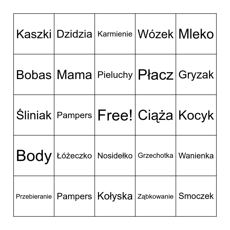 This bingo card has a free space and 24 words: Łóżeczko, Pampers, Pieluchy, Przebieranie, Mleko, Kaszki, Bobas, Dzidzia, Ciąża, Nosidełko, Płacz, Śliniak, Grzechotka, Wanienka, Mama, Ząbkowanie, Kocyk, Karmienie, Gryzak, Pampers, Smoczek, Body, Wózek and Kołyska.