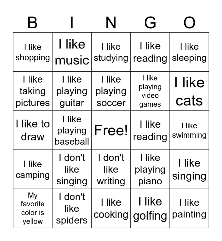 This bingo card has a free space and 24 words: I don't like singing, I don't like spiders, I like playing soccer, My favorite color is yellow, I like sleeping, I like shopping, I like taking pictures, I like music, I like reading, I don't like writing, I like playing video games, I like to draw, I like playing piano, I like singing, I like playing guitar, I like golfing, I like swimming, I like studying, I like cats, I like playing baseball, I like painting, I like camping, I like reading and I like cooking.