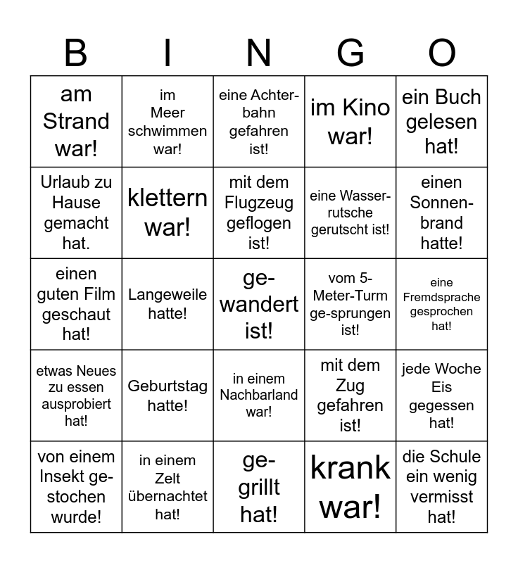 This bingo card has a free space and 24 words: Geburtstag hatte!, in einem Zelt übernachtet hat!, mit dem Flugzeug geflogen ist!, von einem Insekt ge-stochen wurde!, ein Buch gelesen hat!, am Strand war!, Urlaub zu Hause gemacht hat., im Meer schwimmen war!, vom 5-Meter-Turm ge-sprungen ist!, in einem Nachbarland war!, eine Wasser-rutsche gerutscht ist!, einen guten Film geschaut hat!, mit dem Zug gefahren ist!, jede Woche Eis gegessen hat!, klettern war!, krank war!, eine Fremdsprache gesprochen hat!, eine Achter-bahn gefahren ist!, einen Sonnen-brand hatte!, Langeweile hatte!, die Schule ein wenig vermisst hat!, etwas Neues zu essen ausprobiert hat!, im Kino war! and ge- grillt hat!.