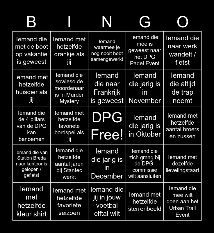 This bingo card has a free space and 24 words: Iemand die hetzelfde aantal jaren bij Stantec werkt, Iemand met hetzelfde favoriete seizoen, Iemand die naar Frankrijk is geweest, Iemand met hetzelfde kleur shirt, Iemand die naar werk wandelt / fietst, Iemand die met de boot op vakantie is geweest, Iemand met hetzelfde huisdier als jij, Iemand met hetzelfde drankje als jij, Iemand die jarig is in Oktober, Iemand die jarig is in December, Iemand die jarig is in November, Iemand die de 4 pillars van de DPG kan benoemen, Iemand die zich graag bij de DPG-commissie wilt aansluiten, Iemand met dezelfde lievelingstaart, Iemand die sowieso de moordenaar is in Murder Mystery, Iemand met hetzelfde sterrenbeeld, Iemand met hetzelfde aantal broers en zussen, Iemand waarmee je nog nooit hebt samengewerkt, Iemand die altijd de trap neemt, Iemand met hetzelfde favoriete bordspel als jij, Iemand die mee wilt doen aan het Urban Trail Event, Iemand die van Station Breda naar kantoor is gelopen / gefietst, Iemand die mee is geweest naar het DPG Padel Event and Iemand die jij in jouw voetbal elftal wilt.