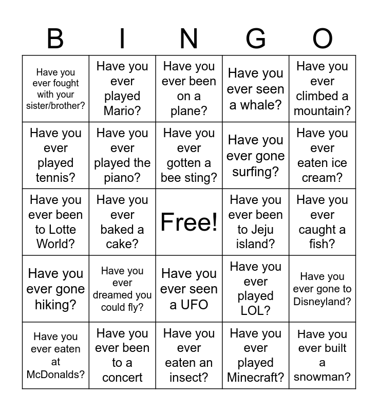 This bingo card has a free space and 38 words: Have you ever had a pet?, Have you ever whistled?, Have you ever found some money?, Have you ever played the piano?, Have you ever gone to Disneyland?, Have you ever dreamed you could fly?, Have you ever gotten a bee sting?, Have you ever swum in the ocean?, Have you ever climbed a mountain?, Have you ever gone surfing?, Have you ever baked a cake?, Have you ever seen a whale?, Have you ever built a snowman?, Have you ever caught a fish?, Have you ever played tennis?, Have you ever gone hiking?, Have you ever broken your phone?, Have you ever been on a plane?, Have you ever broken your arm?, Have you ever been to Jeju island?, Have you ever fought with your sister/brother?, Have you ever been to a concert, Have you ever eaten ice cream?, Have you ever eaten at McDonalds?, Have you ever eaten sushi?, Have you ever eaten an insect?, Have you ever watched a movie in English?, Have you ever ridden a horse?, Have you ever watched Ratatouille?, Have you ever drank coffee?, Have you ever run a marathon?, Have you ever seen a UFO, Have you ever played Minecraft?, Have you ever played Mario?, Have you ever dyed your hair?, Have you ever played LOL?, Have you ever been to Lotte World? and Have you ever eaten Dwaeji Gukbap?.