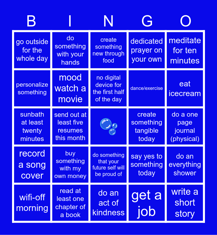 This bingo card has a free space and 24 words: buy something with my own money, read at least one chapter of a book, no digital device for the first half of the day, wifi-off morning, meditate for ten minutes, go outside for the whole day, personalize something, do something with your hands, create something tangible today, do something that your future self will be proud of, dance/exercise, sunbath at least twenty minutes, say yes to something today, do an everything shower, mood watch a movie, get a job, do a one page journal (physical), create something new through food, eat icecream, send out at least five resumes this month, write a short story, record a song cover, dedicated prayer on your own and do an act of kindness.
