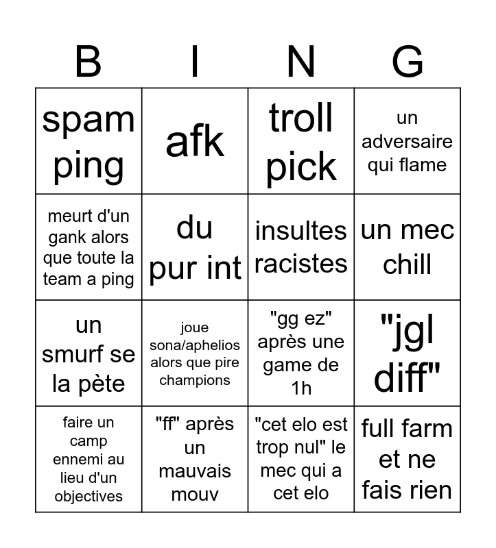 This bingo card has 16 words: "ff" après un mauvais mouv, "jgl diff", troll pick, spam ping, un smurf se la pète, afk, "gg ez" après une game de 1h, "cet elo est trop nul" le mec qui a cet elo, meurt d'un gank alors que toute la team a ping, du pur int, faire un camp ennemi au lieu d'un objectives, un adversaire qui flame, joue sona/aphelios alors que pire champions, un mec chill, insultes racistes and full farm et ne fais rien.