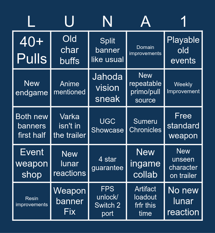 This bingo card has a free space and 24 words: New lunar reactions, Weapon banner Fix, Jahoda vision sneak, Resin improvements, Playable old events, 40+ Pulls, New endgame, Old char buffs, Sumeru Chronicles, 4 star guarantee, New repeatable primo/pull source, Both new banners first half, New ingame collab, New unseen character on trailer, Anime mentioned, Artifact loadout frfr this time, Free standard weapon, Split banner like usual, Weekly Improvement, Varka isn't in the trailer, No new lunar reaction, Event weapon shop, Domain improvements and FPS unlock/ Switch 2 port.