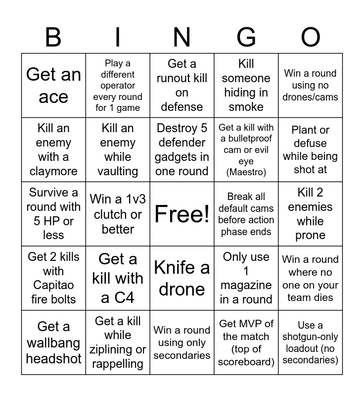 This bingo card has a free space and 25 words: Get a kill with a C4, Win a round using only secondaries, Destroy 5 defender gadgets in one round, Get a wallbang headshot, Win a round using no drones/cams, Get an ace, Kill an enemy with a claymore, Play a different operator every round for 1 game, Break all default cams before action phase ends, Knife a drone, Get a kill with a bulletproof cam or evil eye (Maestro), Survive a round with 5 HP or less, Only use 1 magazine in a round, Win a round where no one on your team dies, Kill an enemy while vaulting, Pick an op you’ve never played before, Kill 2 enemies while prone, Get a runout kill on defense, Plant or defuse while being shot at, Win a 1v3 clutch or better, Use a shotgun-only loadout (no secondaries), Get a kill while ziplining or rappelling, Get 2 kills with Capitao fire bolts, Kill someone hiding in smoke and Get MVP of the match (top of scoreboard).