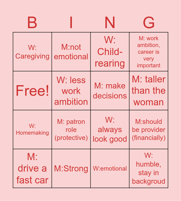This bingo card has 16 words: M:Strong, M:should be provider (financially), W: Child-rearing, W: Caregiving, W: Homemaking, M:not emotional, W: always look good, W:emotional, Free!, W: less work ambition, M: drive a fast car, M: work ambition, career is very important, M: patron role (protective), M: taller than the woman, M: make decisions and W: humble, stay in backgroud.