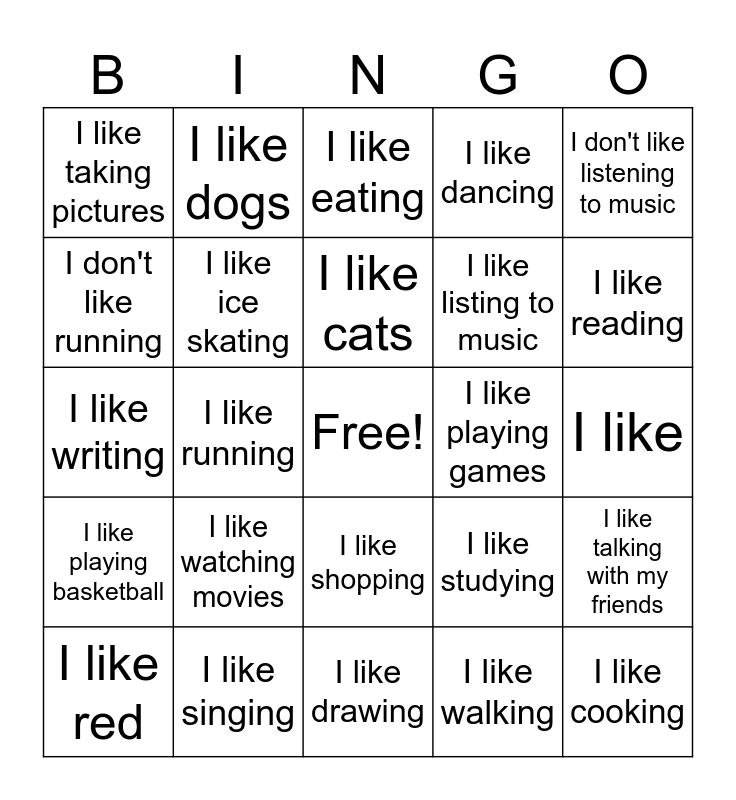 This bingo card has a free space and 24 words: I like watching movies, I like singing, I like cats, I like red, I don't like listening to music, I like taking pictures, I don't like running, I like dogs, I like playing games, I like shopping, I like listing to music, I like writing, I like studying, I like talking with my friends, I like ice skating, I like walking, I like, I like eating, I like reading, I like running, I like cooking, I like playing basketball, I like dancing and I like drawing.