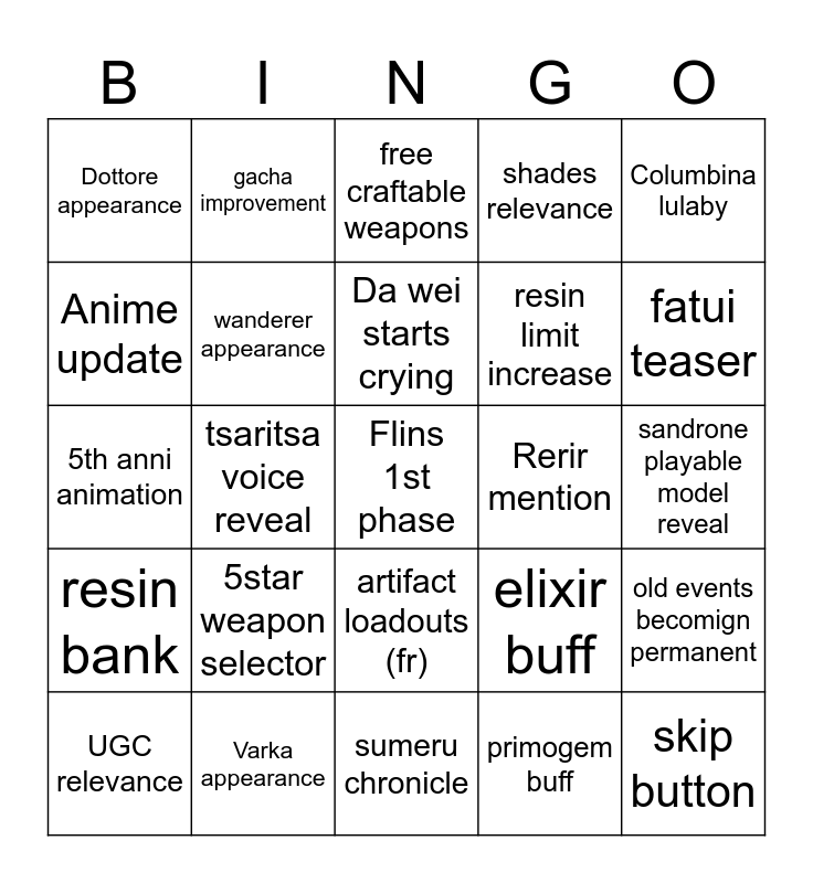 This bingo card has a free space and 24 words: 5star weapon selector, Varka appearance, Da wei starts crying, UGC relevance, Columbina lulaby, Dottore appearance, Anime update, gacha improvement, Rerir mention, artifact loadouts (fr), resin limit increase, 5th anni animation, elixir buff, old events becomign permanent, wanderer appearance, primogem buff, sandrone playable model reveal, free craftable weapons, fatui teaser, tsaritsa voice reveal, skip button, resin bank, shades relevance and sumeru chronicle.