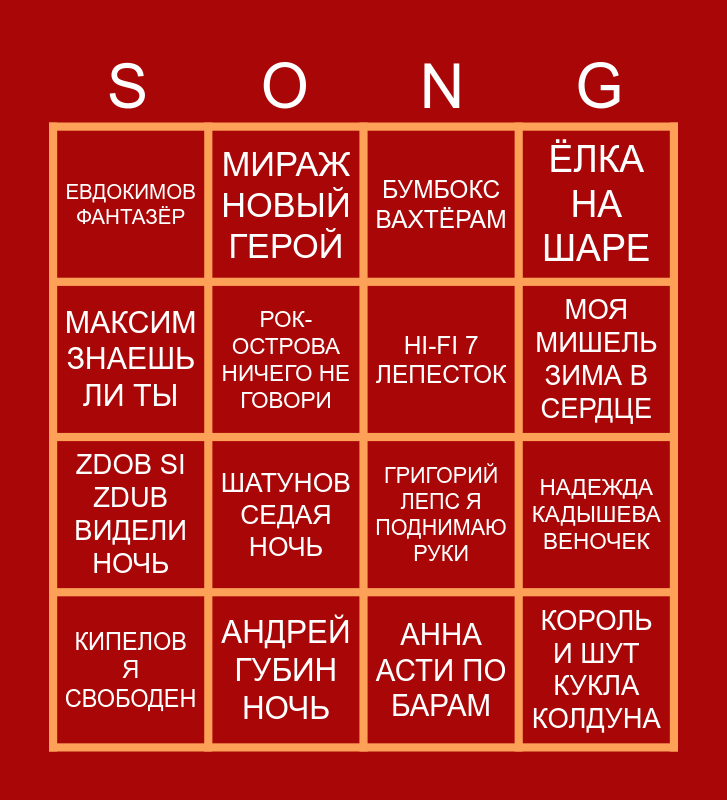 This bingo card has 32 words: НАДЕЖДА КАДЫШЕВА ВЕНОЧЕК, АННА АСТИ ЦАРИЦА, НАДЕЖДА КАДЫШЕВА ВЕНОЧЕК, АННА АСТИ ЦАРИЦА, КОРОЛЬ И ШУТ КУКЛА КОЛДУНА, HI-FI 7 ЛЕПЕСТОК, МАКСИМ ЗНАЕШЬ ЛИ ТЫ, РУКИ ВВЕРХ КРОШКА МОЯ, МИРАЖ НОВЫЙ ГЕРОЙ, ЛАСКОВЫЙ МАЙ БЕЛЫЕ РОЗЫ, МОЯ МИШЕЛЬ ЗИМА В СЕРДЦЕ, БУМБОКС ВАХТЁРАМ, ФИЛИПП КИРКОРОВ Я ЭТУ ЖИЗНЬ ТЕБЕ ОТДАМ, ЛЕОНИД АГУТИН АЭРОПОРТЫ, АНДРЕЙ ГУБИН НОЧЬ, СТРЫКАЛО НАШЕ ЛЕТО, ЧИЖ И CO О ЛЮБВИ, ГРИГОРИЙ ЛЕПС Я ПОДНИМАЮ РУКИ, ЗВЕРИ РАЙОНЫ КВАРТАЛЫ, АЛЛЕГРОВА УГОНЩИЦА, ЖУКИ БАТАРЕЙКА, КАДЫШЕВА ШИРОКА РЕКА, АННА АСТИ ПО БАРАМ, QUEST PISTOLS СТРЕКОЗА ЛЮБВИ, КИПЕЛОВ Я СВОБОДЕН, ЁЛКА НА ШАРЕ, ZDOB SI ZDUB ВИДЕЛИ НОЧЬ, РОК-ОСТРОВА НИЧЕГО НЕ ГОВОРИ, ЕВДОКИМОВ ФАНТАЗЁР, ОТПЕТЫЕ МОШЕННИКИ ЛЮБИ МЕНЯ, IOWA УЛЫБАЙСЯ and ШАТУНОВ СЕДАЯ НОЧЬ.