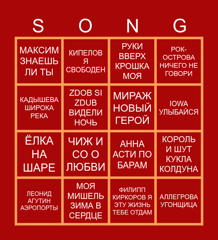 This bingo card has 30 words: НАДЕЖДА КАДЫШЕВА ВЕНОЧЕК, АННА АСТИ ЦАРИЦА, КОРОЛЬ И ШУТ КУКЛА КОЛДУНА, HI-FI 7 ЛЕПЕСТОК, МАКСИМ ЗНАЕШЬ ЛИ ТЫ, РУКИ ВВЕРХ КРОШКА МОЯ, МИРАЖ НОВЫЙ ГЕРОЙ, ЛАСКОВЫЙ МАЙ БЕЛЫЕ РОЗЫ, МОЯ МИШЕЛЬ ЗИМА В СЕРДЦЕ, БУМБОКС ВАХТЁРАМ, ФИЛИПП КИРКОРОВ Я ЭТУ ЖИЗНЬ ТЕБЕ ОТДАМ, ЛЕОНИД АГУТИН АЭРОПОРТЫ, АНДРЕЙ ГУБИН НОЧЬ, СТРЫКАЛО НАШЕ ЛЕТО, ЧИЖ И CO О ЛЮБВИ, ГРИГОРИЙ ЛЕПС Я ПОДНИМАЮ РУКИ, ЗВЕРИ РАЙОНЫ КВАРТАЛЫ, АЛЛЕГРОВА УГОНЩИЦА, ЖУКИ БАТАРЕЙКА, КАДЫШЕВА ШИРОКА РЕКА, АННА АСТИ ПО БАРАМ, QUEST PISTOLS СТРЕКОЗА ЛЮБВИ, КИПЕЛОВ Я СВОБОДЕН, ЁЛКА НА ШАРЕ, ZDOB SI ZDUB ВИДЕЛИ НОЧЬ, РОК-ОСТРОВА НИЧЕГО НЕ ГОВОРИ, ЕВДОКИМОВ ФАНТАЗЁР, ОТПЕТЫЕ МОШЕННИКИ ЛЮБИ МЕНЯ, IOWA УЛЫБАЙСЯ and ШАТУНОВ СЕДАЯ НОЧЬ.
