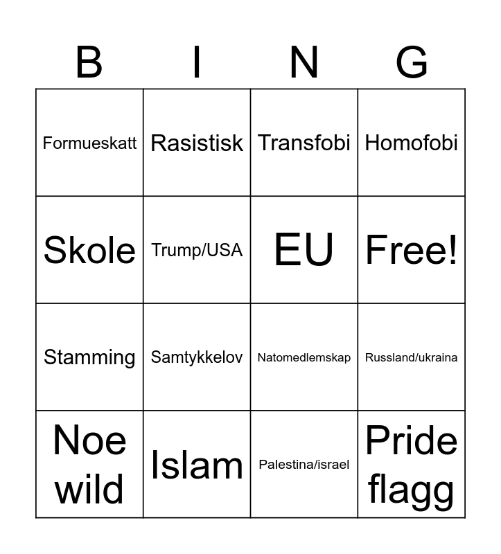 This bingo card has 18 words: Samtykkelov, Pride flagg, Transfobi, Formueskatt, Natomedlemskap, Homofobi, Noe wild, Rasistisk, Free!, Stamming, Palestina/israel, Skole, Russland/ukraina, Trump/USA, EU, Innvandring, Islam and Kristendom.