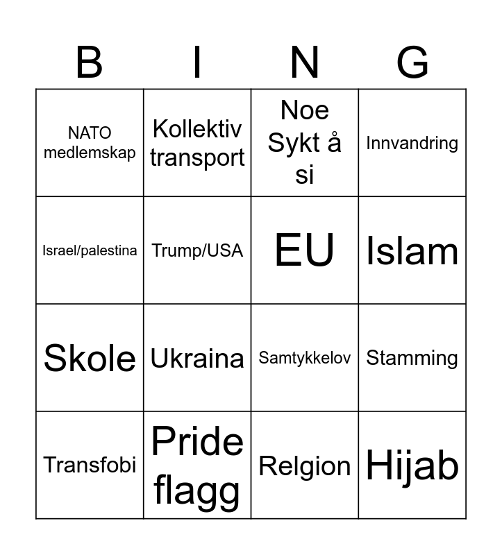 This bingo card has 19 words: Samtykkelov, Rasistisk, Noe Sykt å si, Hijab, Stamming, Israel/palestina, Relgion, NATO medlemskap, Kollektiv transport, Skole, Ukraina, Trump/USA, EU, Pride flagg, Transfobi, Homofobi, Innvandring, Islam and Kristendom.