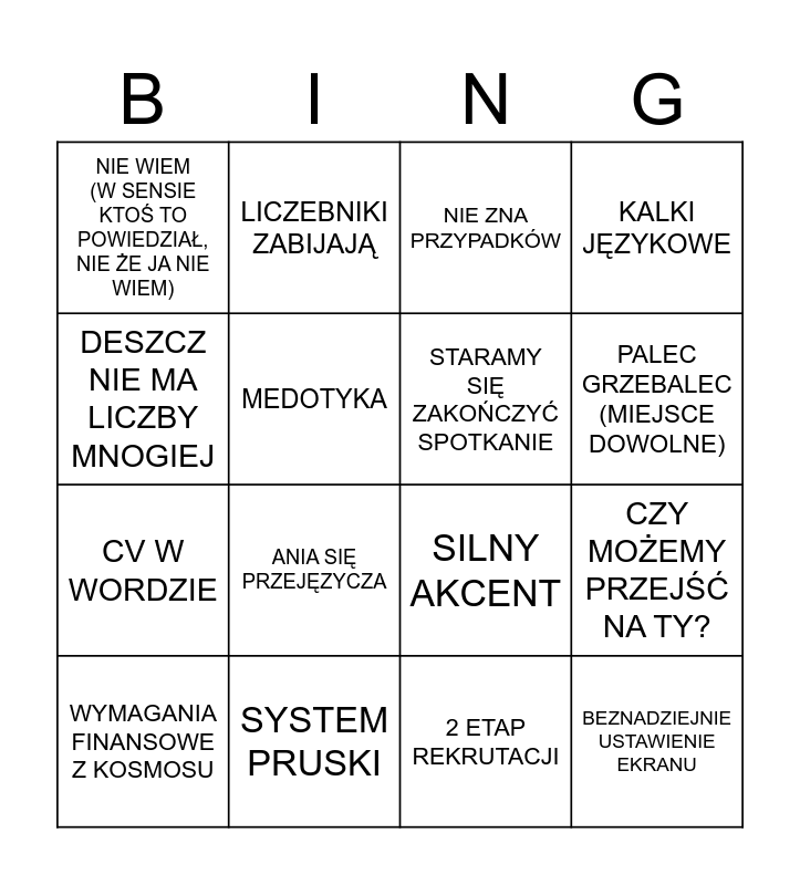 This bingo card has 16 words: SYSTEM PRUSKI, CZY MOŻEMY PRZEJŚĆ NA TY?, NIE ZNA PRZYPADKÓW, NIE WIEM (W SENSIE KTOŚ TO POWIEDZIAŁ, NIE ŻE JA NIE WIEM), CV W WORDZIE, LICZEBNIKI ZABIJAJĄ, SILNY AKCENT, 2 ETAP REKRUTACJI, DESZCZ NIE MA LICZBY MNOGIEJ, MEDOTYKA, WYMAGANIA FINANSOWE Z KOSMOSU, KALKI JĘZYKOWE, ANIA SIĘ PRZEJĘZYCZA, PALEC GRZEBALEC (MIEJSCE DOWOLNE), STARAMY SIĘ ZAKOŃCZYĆ SPOTKANIE and BEZNADZIEJNIE USTAWIENIE EKRANU.