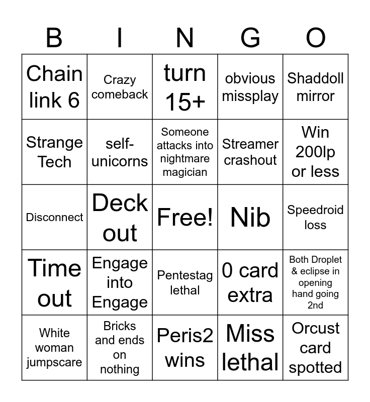 This bingo card has a free space and 24 words: Engage into Engage, Bricks and ends on nothing, Someone attacks into nightmare magician, White woman jumpscare, Shaddoll mirror, Chain link 6, Strange Tech, Crazy comeback, Nib, Pentestag lethal, Streamer crashout, Disconnect, 0 card extra, Both Droplet & eclipse in opening hand going 2nd, self-unicorns, Miss lethal, Speedroid loss, turn 15+, Win 200lp or less, Deck out, Orcust card spotted, Time out, obvious missplay and Peris2 wins.