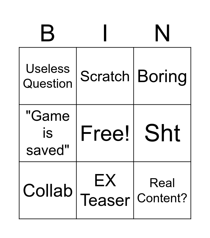 This bingo card has a free space and 8 words: Sht, Boring, Scratch, Collab, Useless Question, Real Content?, "Game is saved" and EX Teaser.