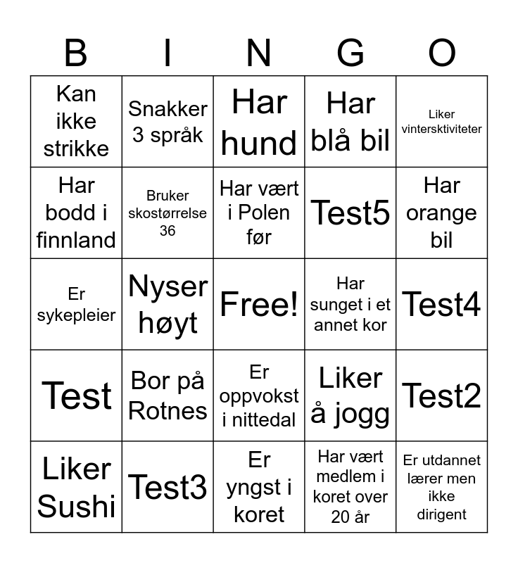This bingo card has a free space and 26 words: Er oppvokst i nittedal, Har vært medlem i koret over 20 år, Har vært i Polen før, Test3, Liker vintersktiviteter, Kan ikke strikke, Har bodd i finnland, Snakker 3 språk, Test4, Liker å jogg, Test5, Er sykepleier, Test2, Liker Sushi, Nyser høyt, Spiller flere enn ett instrument, Har blå bil, Test, Har hund, Er utdannet lærer men ikke dirigent, Har orange bil, Er yngst i koret, Har sunget i et annet kor, Bor på Rotnes, Bruker skostørrelse 36 and Har vært prinsesse.