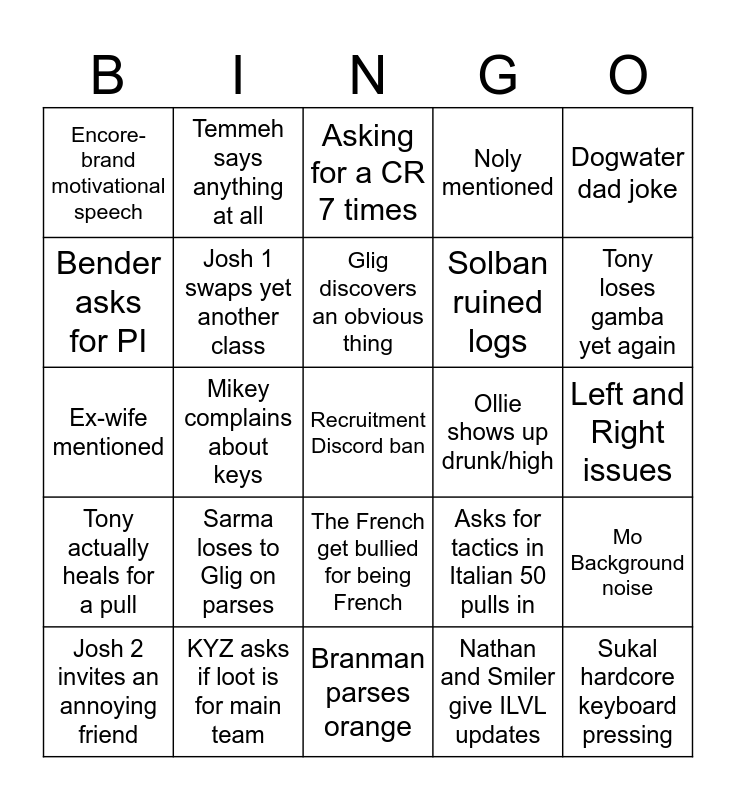 This bingo card has a free space and 24 words: Sarma loses to Glig on parses, KYZ asks if loot is for main team, Glig discovers an obvious thing, Josh 2 invites an annoying friend, Dogwater dad joke, Encore-brand motivational speech, Bender asks for PI, Temmeh says anything at all, Ollie shows up drunk/high, The French get bullied for being French, Solban ruined logs, Ex-wife mentioned, Asks for tactics in Italian 50 pulls in, Mo Background noise, Josh 1 swaps yet another class, Nathan and Smiler give ILVL updates, Left and Right issues, Asking for a CR 7 times, Tony loses gamba yet again, Mikey complains about keys, Sukal hardcore keyboard pressing, Tony actually heals for a pull, Noly mentioned and Branman parses orange.