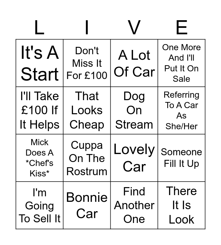 This bingo card has 16 words: Bonnie Car, Someone Fill It Up, A Lot Of Car, It's A Start, Mick Does A *Chef's Kiss*, Don't Miss It For £100, Lovely Car, Find Another One, I'll Take £100 If It Helps, That Looks Cheap, I'm Going To Sell It, One More And I'll Put It On Sale, Cuppa On The Rostrum, Referring To A Car As She/Her, Dog On Stream and There It Is Look.