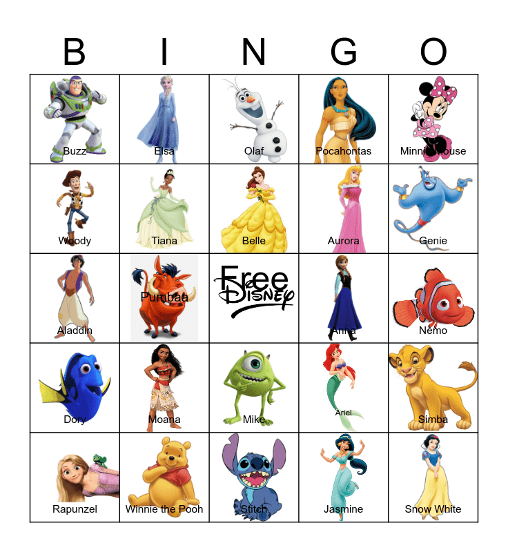 This bingo card has 29 images, a free space and 29 words: Mickey Mouse, Winnie the Pooh, Olaf, Miguel, Minnie Mouse, Buzz, Tiana, Belle, Anna, Simba, Rapunzel, Pumbaa, Jasmine, Snow White, Aladdin, Mulan, Stitch, Ariel, Genie, Dory, Moana, Cinderella, Aurora, Nemo, Woody, Elsa, Mike, Pocahontas and Joy.