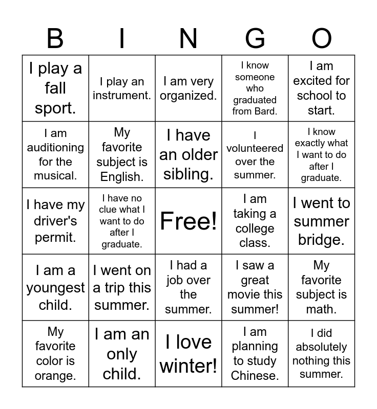 This bingo card has a free space and 24 words: I went on a trip this summer., I am an only child., I have an older sibling., My favorite color is orange., I am excited for school to start., I play a fall sport., I am auditioning for the musical., I play an instrument., I am taking a college class., I had a job over the summer., I volunteered over the summer., I have my driver's permit., I saw a great movie this summer!, My favorite subject is math., My favorite subject is English., I am planning to study Chinese., I went to summer bridge., I am very organized., I know exactly what I want to do after I graduate., I have no clue what I want to do after I graduate., I did absolutely nothing this summer., I am a youngest child., I know someone who graduated from Bard. and I love winter!.