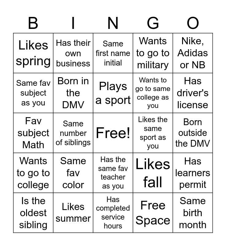 This bingo card has a free space and 25 words: Same fav color, Has completed service hours, Plays a sport, Is the oldest sibling, Nike, Adidas or NB, Likes spring, Same fav subject as you, Has their own business, Likes the same sport as you, Has the same fav teacher as you, Wants to go to same college as you, Fav subject Math, Likes fall, Has learners permit, Born in the DMV, Likes winter, Born outside the DMV, Same first name initial, Has driver's license, Same number of siblings, Same birth month, Likes summer, Wants to go to college, Wants to go to military and Free Space.