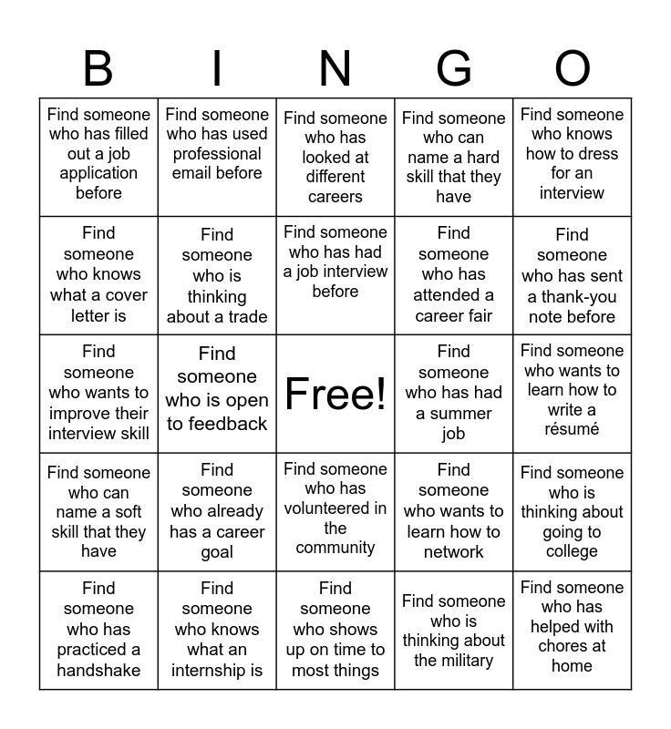 This bingo card has a free space and 24 words: Find someone who already has a career goal, Find someone who knows what an internship is, Find someone who has had a job interview before, Find someone who has practiced a handshake, Find someone who knows how to dress for an interview, Find someone who has filled out a job application before, Find someone who knows what a cover letter is, Find someone who has used professional email before, Find someone who has had a summer job, Find someone who has volunteered in the community, Find someone who has attended a career fair, Find someone who wants to improve their interview skill, Find someone who wants to learn how to network, Find someone who is thinking about going to college, Find someone who is thinking about a trade, Find someone who is thinking about the military, Find someone who wants to learn how to write a résumé, Find someone who has looked at different careers, Find someone who has sent a thank-you note before, Find someone who is open to feedback, Find someone who has helped with chores at home, Find someone who can name a soft skill that they have, Find someone who can name a hard skill that they have and Find someone who shows up on time to most things.
