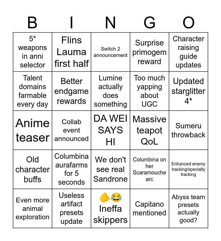 This bingo card has a free space and 24 words: Columbina aurafarms for 5 seconds, Useless artifact presets update, Lumine actually does something, Even more animal exploration, Character raising guide updates, 5* weapons in anni selector, Talent domains farmable every day, Flins Lauma first half, Massive teapot QoL, We don't see real Sandrone, Too much yapping about UGC, Anime teaser, Columbina on her Scaramouche arc, Enhanced enemy tracking/specialty tracking, Better endgame rewards, Capitano mentioned, Sumeru throwback, Switch 2 announcement, Updated starglitter 4*, Collab event announced, Abyss team presets actually good?, Old character buffs, Surprise primogem reward and 🫵😂Ineffa skippers.