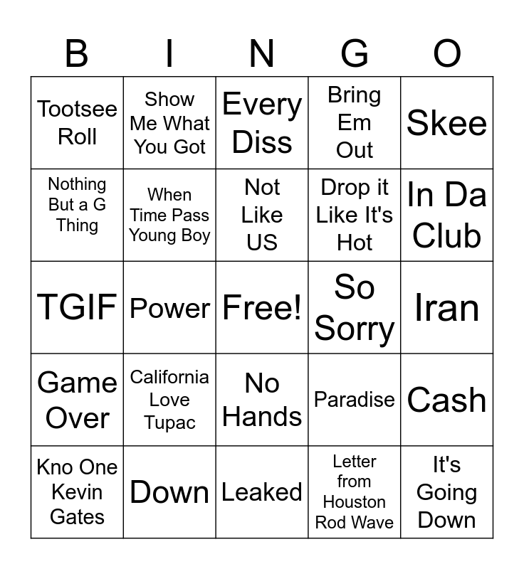 This bingo card has a free space and 24 words: California Love Tupac, Down, Not Like US, Kno One Kevin Gates, Skee, Tootsee Roll, Nothing But a G Thing, Show Me What You Got, So Sorry, No Hands, Drop it Like It's Hot, TGIF, Paradise, Cash, When Time Pass Young Boy, Letter from Houston Rod Wave, Iran, Every Diss, In Da Club, Power, It's Going Down, Game Over, Bring Em Out and Leaked.