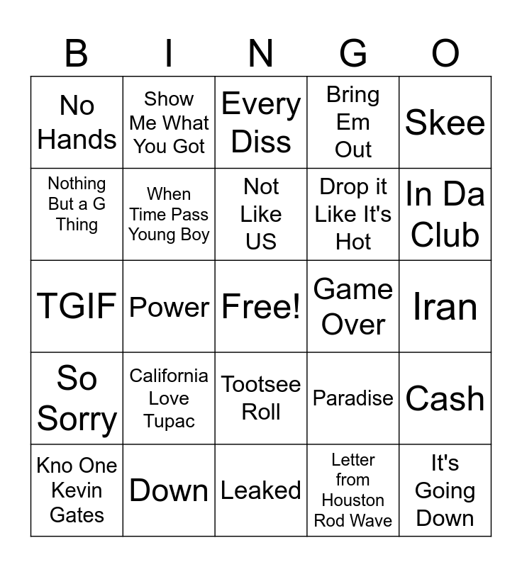 This bingo card has a free space and 24 words: California Love Tupac, Down, Not Like US, Kno One Kevin Gates, Skee, No Hands, Nothing But a G Thing, Show Me What You Got, Game Over, Tootsee Roll, Drop it Like It's Hot, TGIF, Paradise, Cash, When Time Pass Young Boy, Letter from Houston Rod Wave, Iran, Every Diss, In Da Club, Power, It's Going Down, So Sorry, Bring Em Out and Leaked.