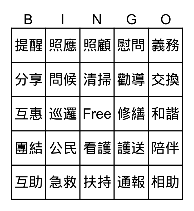 This bingo card has a free space and 50 words: 守望, 相助, 關照, 扶持, 公民, 教育, 照應, 支援, 分享, 借還, 問候, 慰問, 陪伴, 護送, 代購, 輪值, 清掃, 修繕, 捐贈, 義務, 巡邏, 通報, 提醒, 勸導, 調解, 共享, 交換, 贈予, 照顧, 看護, 接送, 教導, 有禮, 待人, 急救, 防災, 應變, 合作, 同心, 和諧, 友善, 熱心, 奉獻, 無償, 互助, 互惠, 民生, 民太, 團結 and 共融.