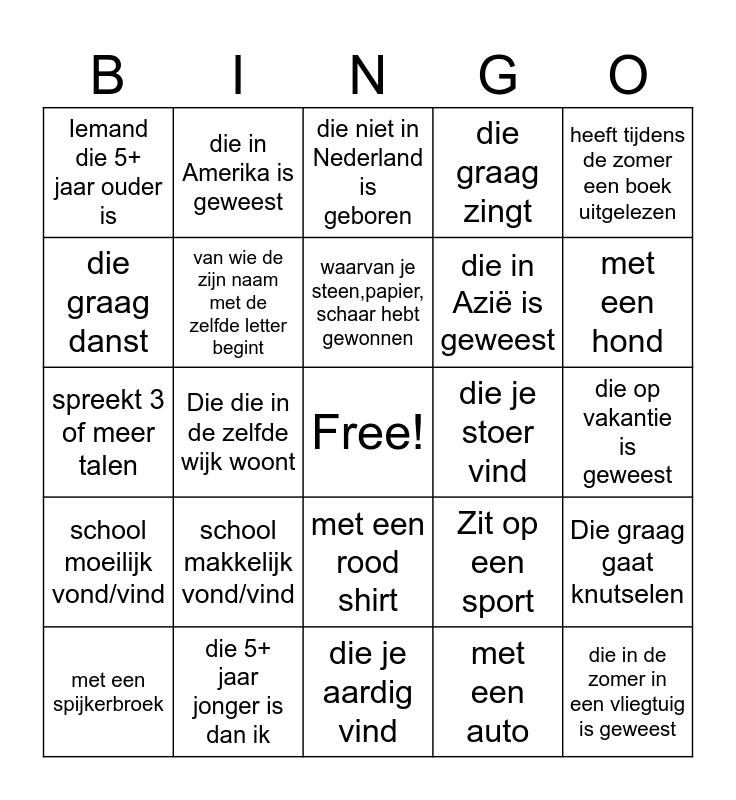 This bingo card has a free space and 30 words: die 5+ jaar jonger is dan ik, met de zelfde hobby, Die die in de zelfde wijk woont, die leuk werk heeft, Iemand die 5+ jaar ouder is, die niet in Nederland is geboren, van wie de zijn naam met de zelfde letter begint, met een rood shirt, die je stoer vind, die je aardig vind, die op vakantie is geweest, die in de zomer in een vliegtuig is geweest, met een auto, met een kat, met een hond, Lievelingskleur Groen, Zit op een sport, school moeilijk vond/vind, school makkelijk vond/vind, heeft tijdens de zomer een boek uitgelezen, spreekt 3 of meer talen, speelt een muziek instrument, die in Amerika is geweest, die in Azië is geweest, die graag danst, die graag zingt, Die graag gaat knutselen, met een spijkerbroek, waarvan je steen,papier, schaar hebt gewonnen and waarvan je steen,papier, schaar hebt verloren.