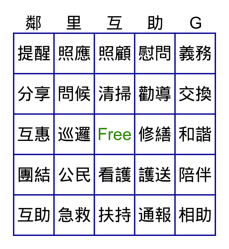 This bingo card has a free space and 50 words: 守望, 相助, 關照, 扶持, 公民, 教育, 照應, 支援, 分享, 借還, 問候, 慰問, 陪伴, 護送, 代購, 輪值, 清掃, 修繕, 捐贈, 義務, 巡邏, 通報, 提醒, 勸導, 調解, 共享, 交換, 贈予, 照顧, 看護, 接送, 教導, 有禮, 待人, 急救, 防災, 應變, 合作, 同心, 和諧, 友善, 熱心, 奉獻, 無償, 互助, 互惠, 民生, 民太, 團結 and 共融.