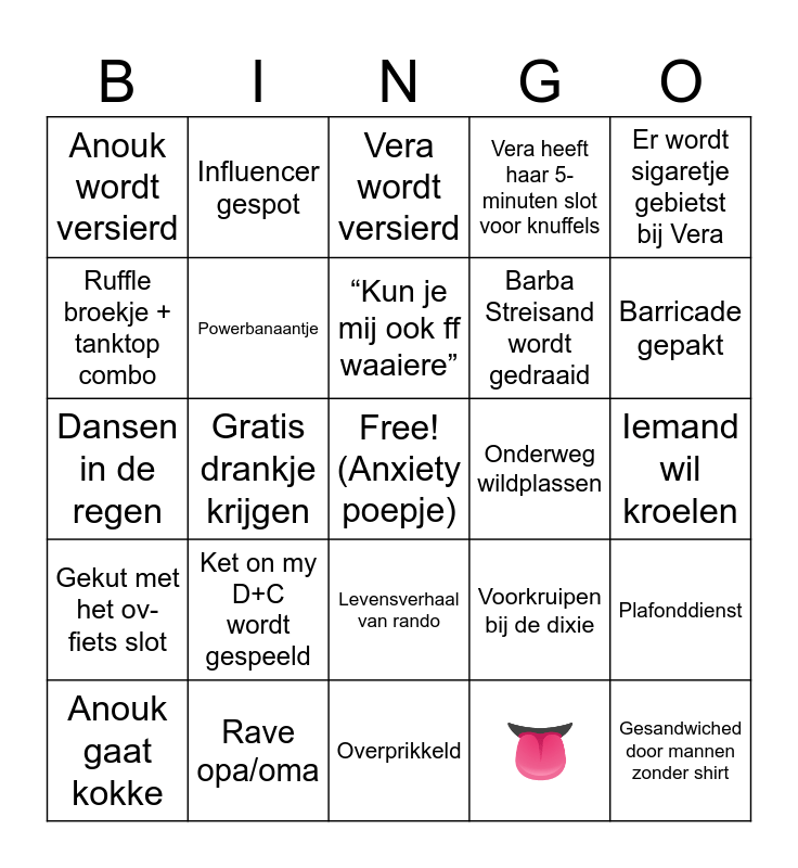 This bingo card has a free space and 24 words: Ket on my D+C wordt gespeeld, Rave opa/oma, “Kun je mij ook ff waaiere”, Anouk gaat kokke, Er wordt sigaretje gebietst bij Vera, Anouk wordt versierd, Ruffle broekje + tanktop combo, Influencer gespot, Onderweg wildplassen, Levensverhaal van rando, Barba Streisand wordt gedraaid, Dansen in de regen, Voorkruipen bij de dixie, Plafonddienst, Powerbanaantje, 👅, Iemand wil kroelen, Vera wordt versierd, Barricade gepakt, Gratis drankje krijgen, Gesandwiched door mannen zonder shirt, Gekut met het ov-fiets slot, Vera heeft haar 5-minuten slot voor knuffels and Overprikkeld.