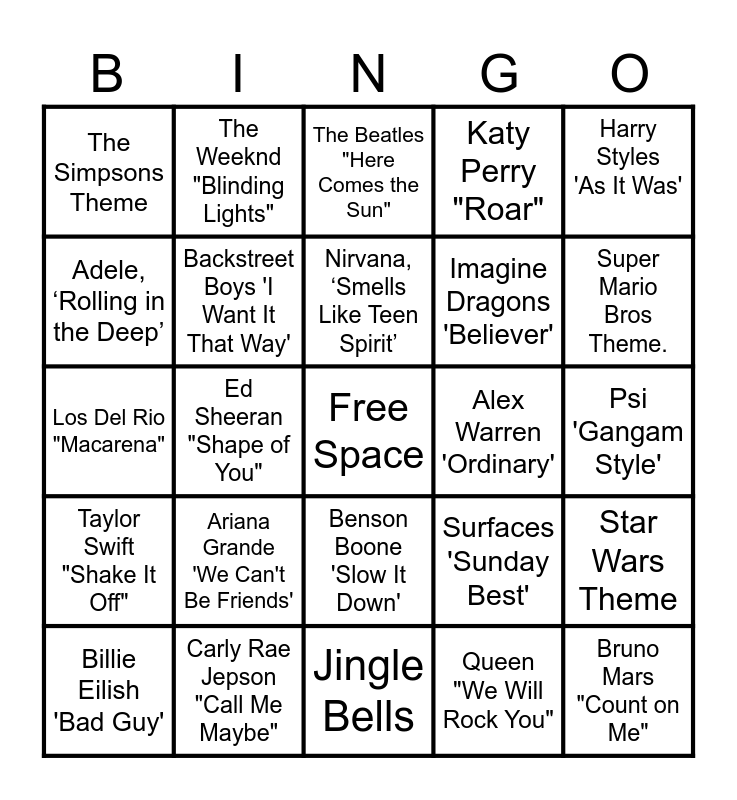 This bingo card has a free space and 24 words: Ariana Grande 'We Can't Be Friends', Carly Rae Jepson "Call Me Maybe", Nirvana, ‘Smells Like Teen Spirit’, Billie Eilish 'Bad Guy', Harry Styles 'As It Was', The Simpsons Theme, Adele, ‘Rolling in the Deep’, The Weeknd "Blinding Lights", Alex Warren 'Ordinary', Benson Boone 'Slow It Down', Imagine Dragons 'Believer', Los Del Rio "Macarena", Surfaces 'Sunday Best', Star Wars Theme, Backstreet Boys 'I Want It That Way', Queen "We Will Rock You", Psi 'Gangam Style', The Beatles "Here Comes the Sun", Super Mario Bros Theme., Ed Sheeran "Shape of You", Bruno Mars "Count on Me", Taylor Swift "Shake It Off", Katy Perry "Roar" and Jingle Bells.